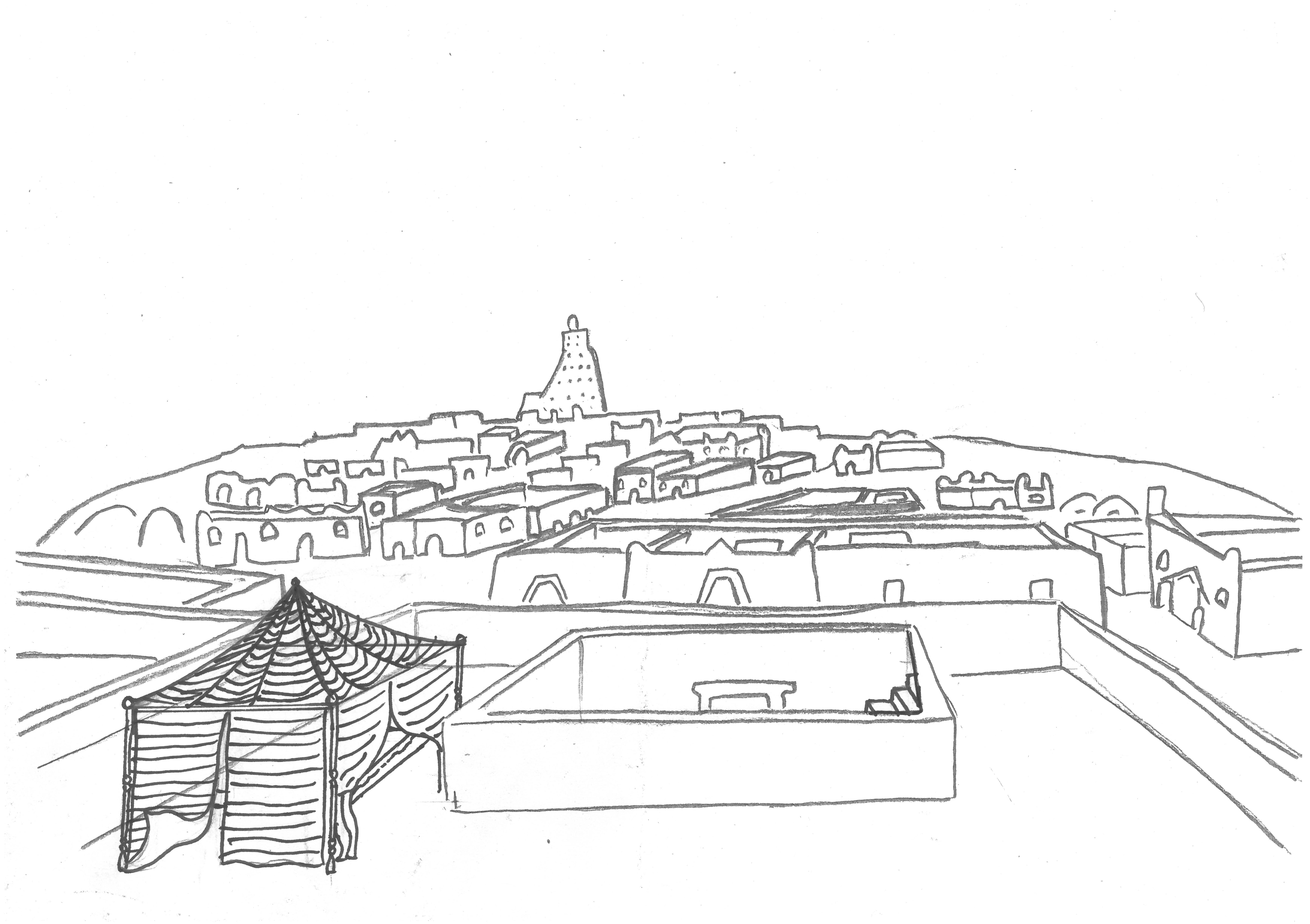 3 Hafen Timbuktus: Als Handelsstadt lag Timbuktu ursprünglich direkt am Fluss Ghir n-igheren (Niger) und hatte einen Hafen. Doch schon zu Zeiten unserer Erzählung hatte der Fluss seinen Lauf geändert und floss ca. 10 km südlich. Timbuktu baute einen Kanal bis zur Stadtmauer, der mit einem Hafenbecken endete. Unten am Fluss entwickelte sich ein Dorf, in dem Fischer*innen lebten und Familien, die den Waren- und Menschentransport zwischen Fluss und Stadt organisierten.